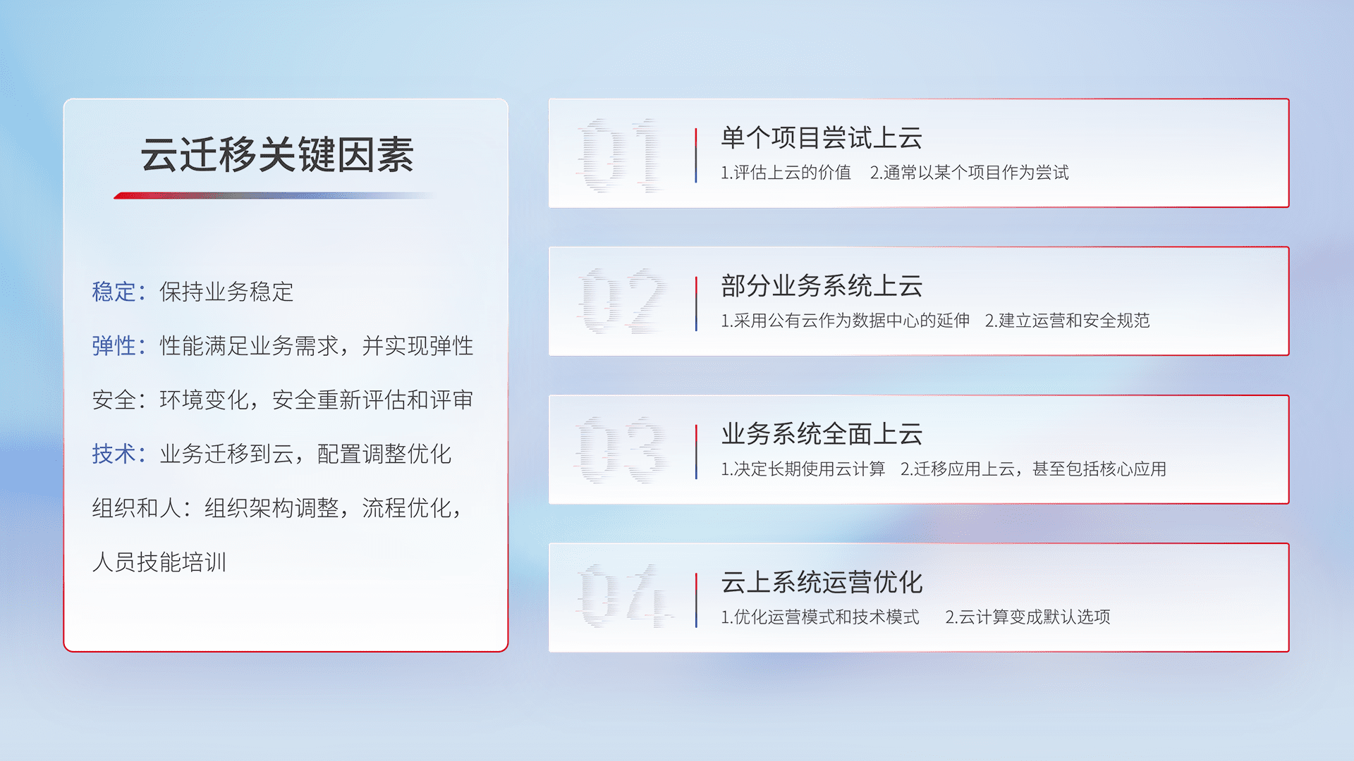 结合实际业务,,从规划设计、、、、云平台选型、、、云原生改造、、数据迁移、、、集成交付,,,迁移全过程为客户识别最佳上云路径,,,,做好风险识别管理,,,设计网络架构、、、身份权限、、安全审计合规、、操作审计、、日志审计、、、监控告警策略、、、多站点容灾设计等,,,,对云上基础设施进行整体规划,,,,提升IT治理水平,,,,以满足弹性、、、高可用、、、高性能的需求。。。