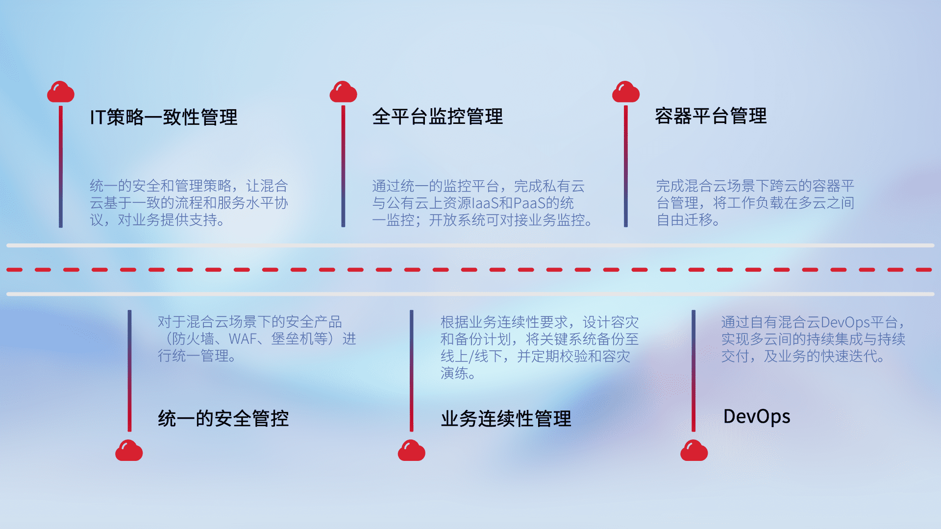 通过多云纳管,,,,以统一的资源数据模型把客户的云资源进行抽象和封装,,进而实现对多云资源的统一操作,,,保障云资源管理的可靠性、、、稳定性与可用性。。量身定制化运维内容,,,配置、、开发运维、、、、补丁管理、、、、备份、、、、监控、、、、认证和访问管理、、、、审计和日常巡检等,,,,保障在用云过程中的可靠度,,,,稳定度以及高可用率。。