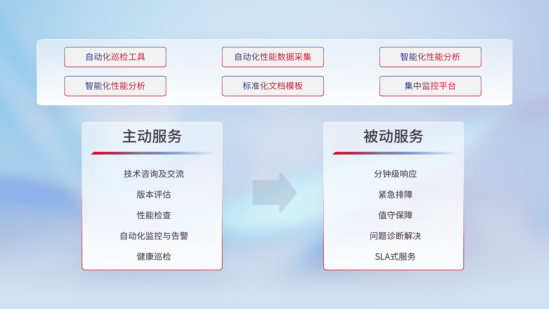 智能化工具和标准化文档,,,保障服务质量,,,,提供主动服务(包含技术咨询、、、、版本评估、、、性能检查、、自动化监控与告警、、、健康巡检)和被动服务包含(分钟级响应、、、紧急排障、、、值守保障、、、、问题诊断解决、、、SLA服务)。。。